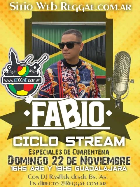 El viaje musical y charla periodística continúa el próximo DOMINGO 22 de NOVIEMBRE desde las 16:00 horas (ARG) (CHL) (URU) – 13:00 horas (MEX) – 14:00 horas (CLB) con un verdadero representante de la escena del reggae de habla hispana: JAH FABIO. Por medio de una comunicación directa desde la ciudad de Guadalajara (México), con el vocalista y compositor mexicano. Repasamos toda su historia, carrera, y conocemos los nuevos proyectos del artista cuyo nombre original es Favio Alejandro Velasco Campos.